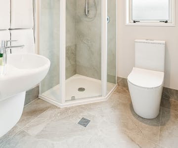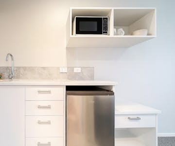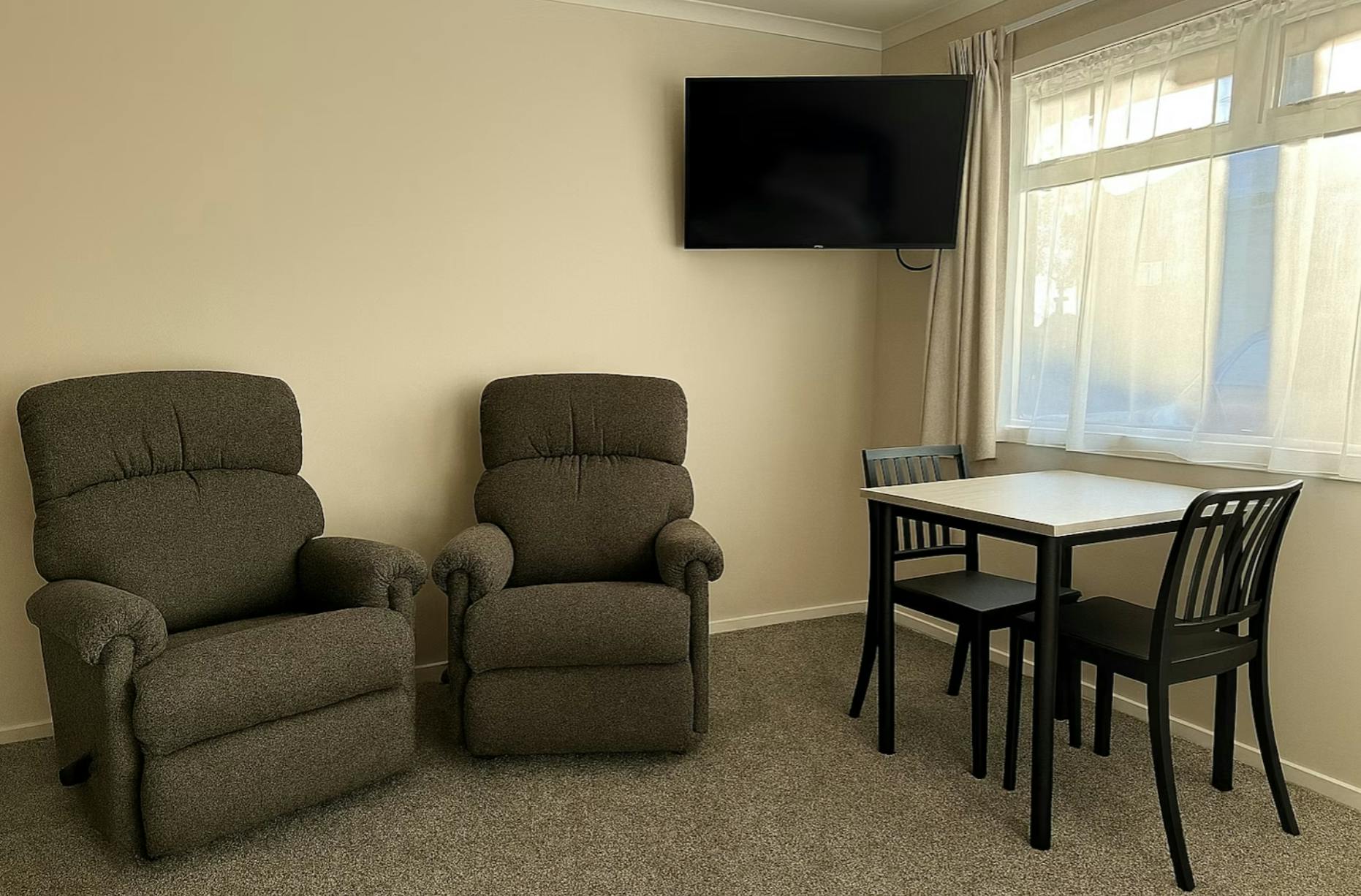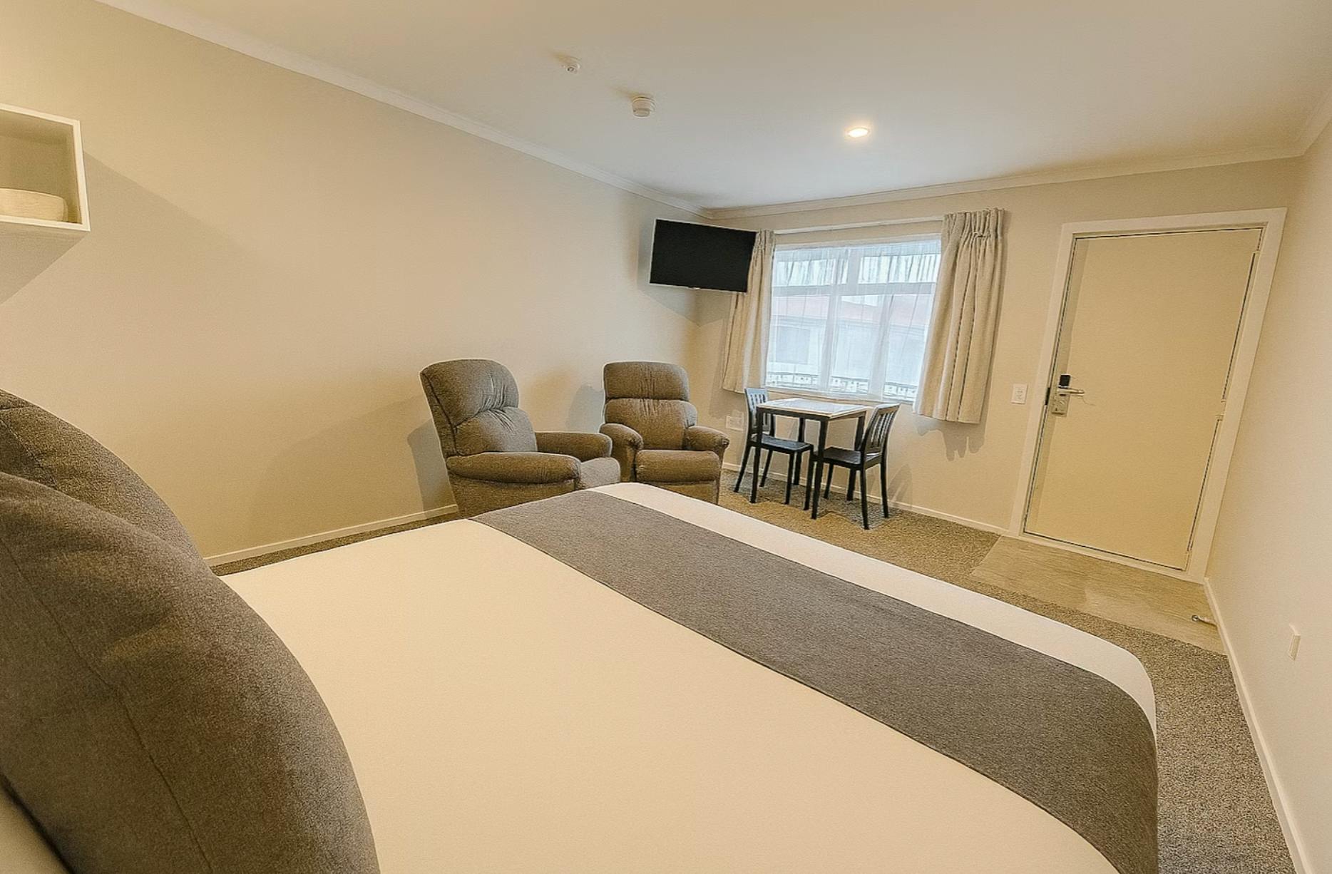 Newly Renovated - Deluxe Studio featuring a King bed with spacious ensuite bathroom with shower, kitchenette with microwave, complimentary tea & coffee, Smart TV, air-conditioning, table & chairs and La-Z-Boy arm chairs